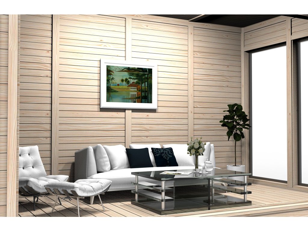 - panel pokrytý vnitřními obkladovými deskami o rozměrech 14 x 96 mm a vnějšími 18 x 145 mm