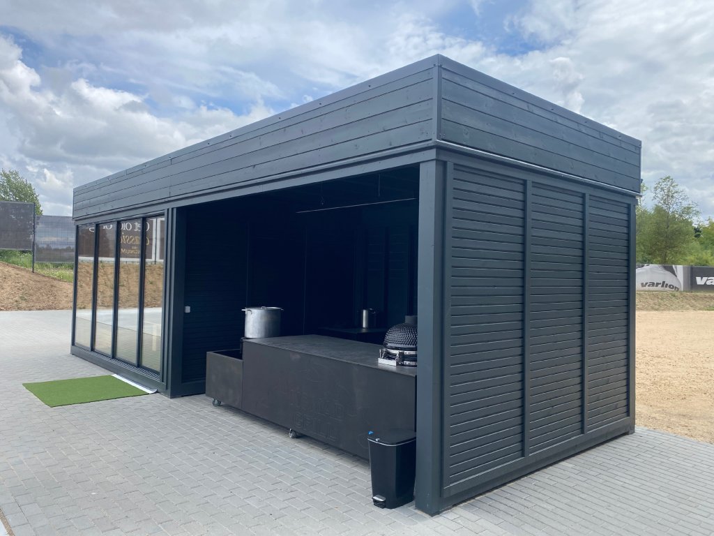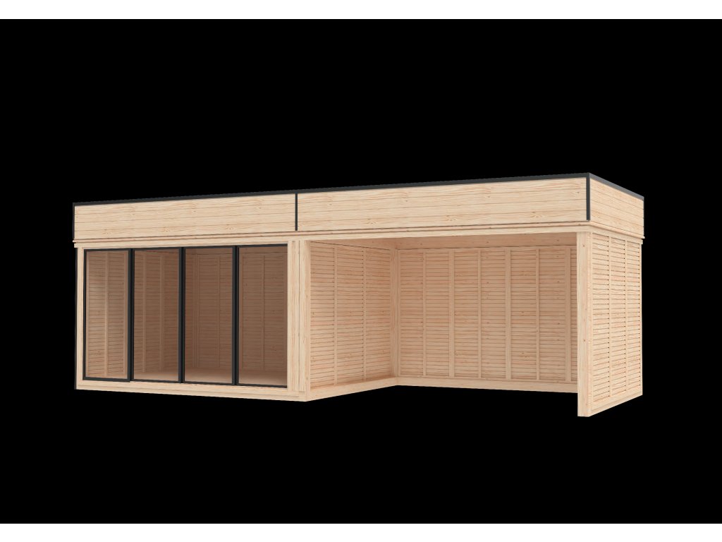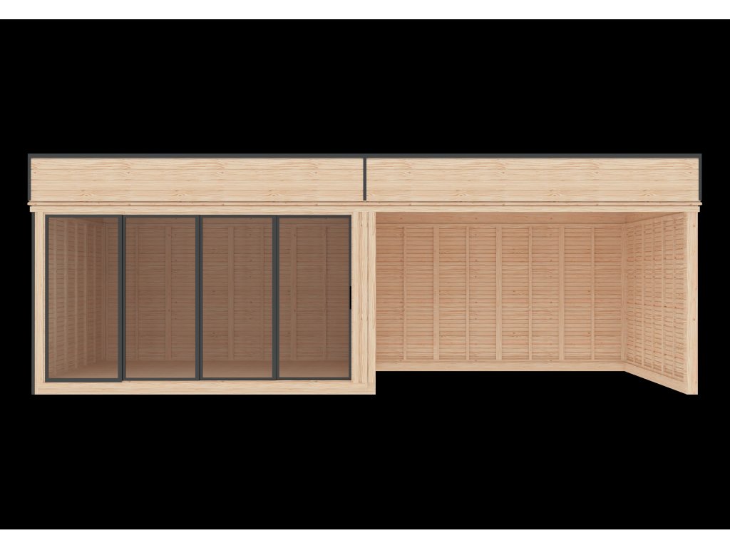 Tento multifunkční zahradní domek vyniká svou jednoduchostí mnoha možnostmi využití a to přes klasický zahradní domek, zastřešené posezení, letní kuchyň až po reprezentativní kancelář.
